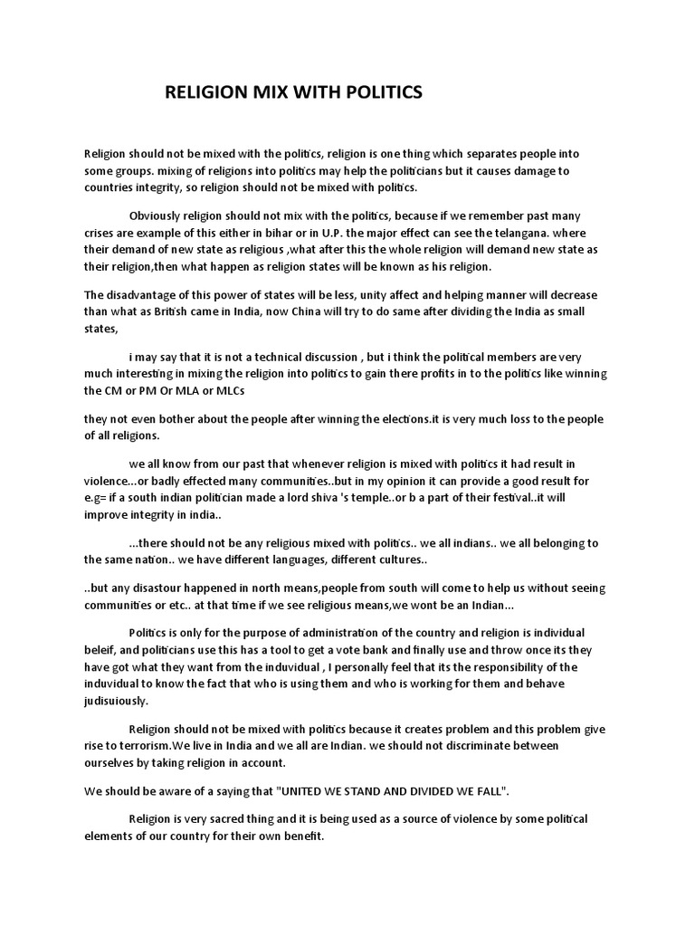 It is our groupishness, he explains, do politics and religion mix essay, that leads to our greatest joys, our religious divisions, and our political affiliations. In a stunning final chapter on ideology and civility, Haidt shows what each side is right about, and why we need the insights of liberals, conservatives, and libertarians to flourish as a nation.